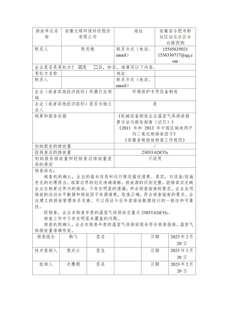 安徽Yy易游体育环保科技股份有限公司2022年度温室气体排放核查报告